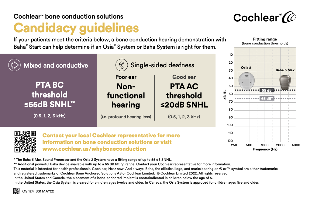 - Any cause conductive or mixed hearing loss (with maximum average bone conduction thresholds of 55 dB)